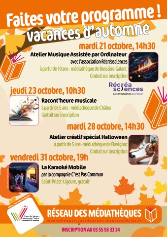 Programme des vacances Afficher les options de partage × Partager Atelier Musique Assistée par Ordinateur, Racont'heure musicale, Atelier créatif spécial Halloween et Karaoké. Détails des prochaines sessions Du mardi 21 octobre 2025 à 14:30 au vendredi 31 octobre 2025 à 22:00