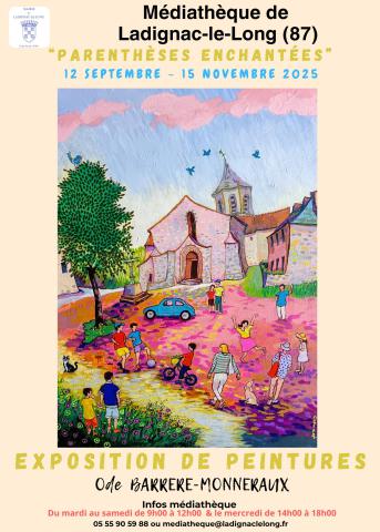 Venez découvrir l'univers vivant et colorée de la peintre Ode Barrere-Monneraux à la médiathèque de Ladignac Le Long, 5 rue du 8 mai 45 - Entrée libre du mardi au samedi de 9h -12h et le mercredi après midi de 14h - 18h.
