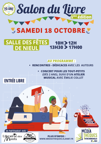 C'est avec grand plaisir que nous vous annonçons la tenue de notre 1er Salon du livre, organisé à l'occasion des 20 ans du réseau des médiathèques ELAN, coorganisé avec les librairies Rev'en Pages et la Librairie des Monts !