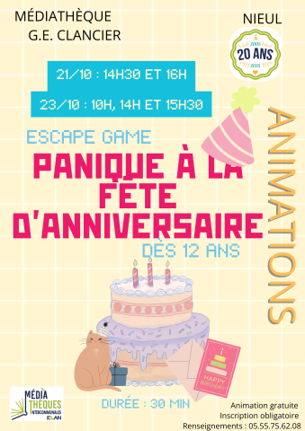 Retrouvez pour les vacances de la Toussaint (et pour la dernière fois !) notre escape game "Panique à la fête d'anniversaire", créé à l'occasion des 20 ans des médiathèques.