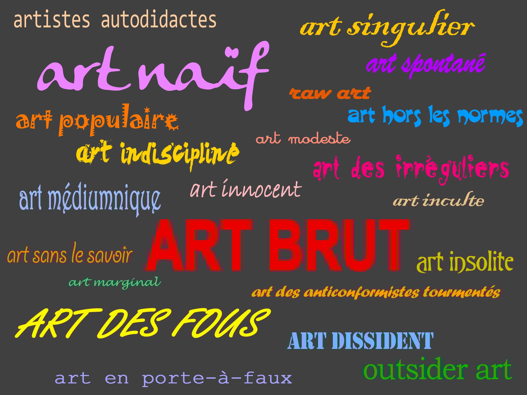 Dès la fin du XIXe siècle, des artistes et des intellectuels de plus en plus nombreux se sont intéressés à des productions élaborées par des personnes n’ayant pas reçu de formation dans un cadre institutionnel. On a d’abord parlé de "naïfs" de "primitifs" ou d’"art des fous" et les appellations se sont multipliées jusqu’à nos jours pour désigner des œuvres auxquelles on accorde un grand intérêt, mais que souvent on ne peut définir que négativement. L’expression "Art brut" a été introduite en 1945 par jean Dubuffet pour désigner les arts "non culturels". Aujourd’hui, ces productions sont présentées dans de nombreux lieux et sont donc entrées paradoxalement dans le champ de la culture et de ses institutions !